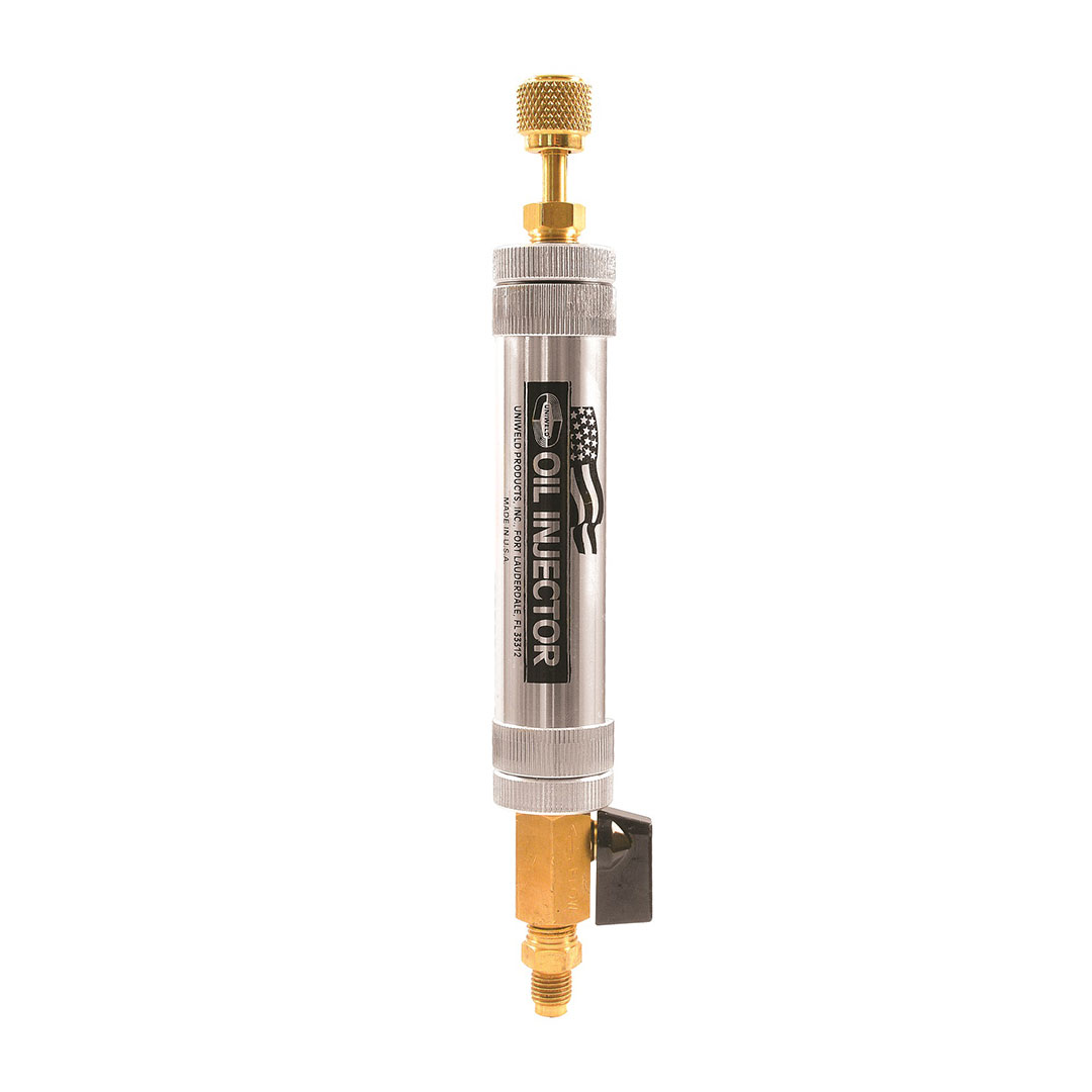 Uniweld’s refillable Oil/Dye Injector has a 2 oz. capacity. The anodized aluminum body and end caps are fitted with O-ring seals. Attach the injector directly to the manifold low side hose connection and add oil/dye to the system. Available with optional 1/2″ Acme fittings or 1/4″ Flare fittings.