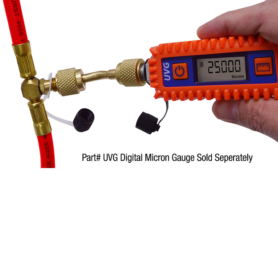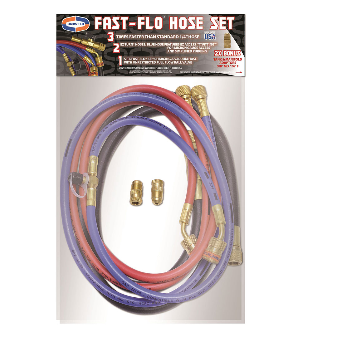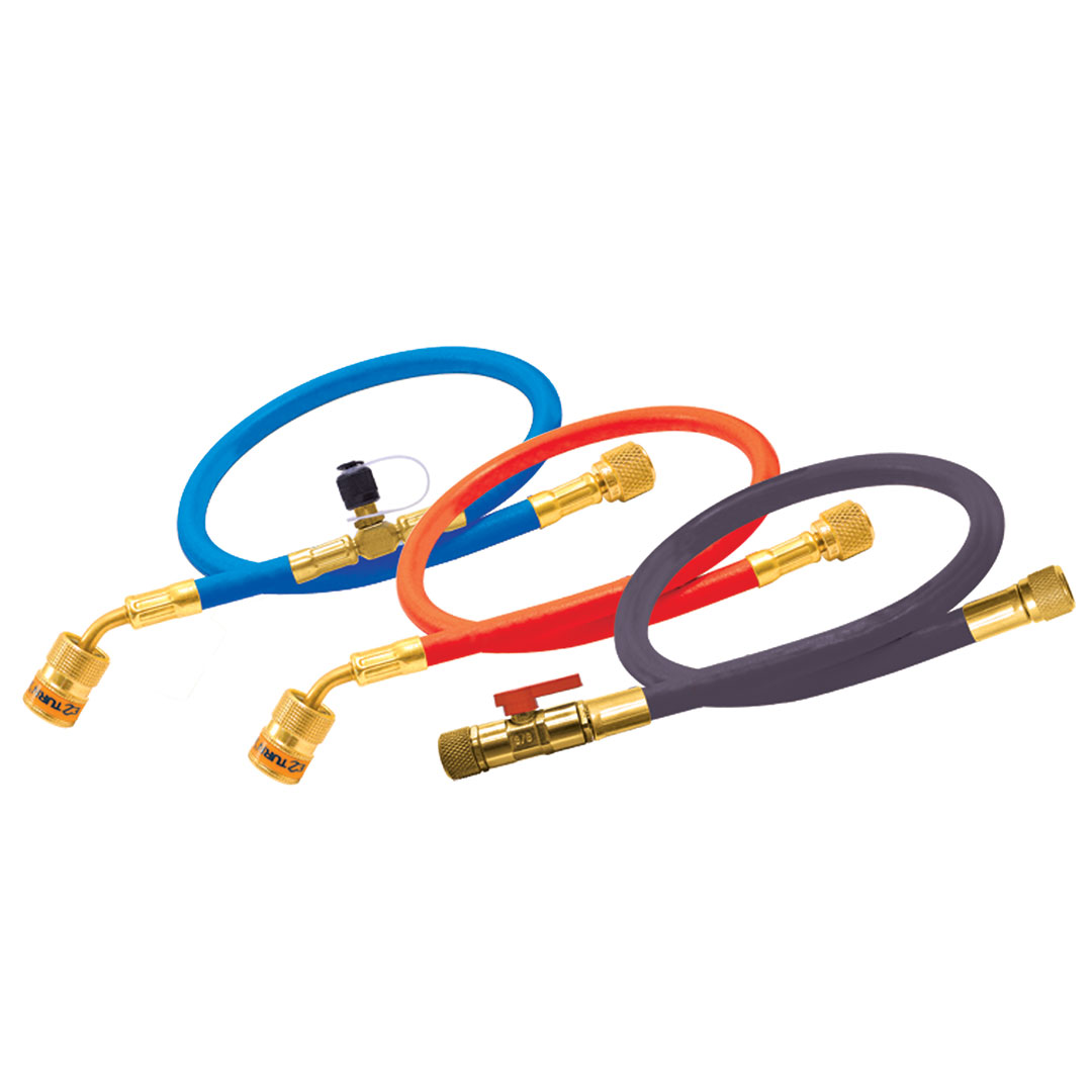 | EZF5HS | 5′ | Hose Set | EZ turn 1/4″ Hose | EZ turn 1/4″ Hose with an EZ Access “T” Fitting™ for micron gauge connection. | 3/8″ charging and vacuum hose with full flow ball valve shutoff | Blue Hose | (2) 3/8″ x 1/4″ tank adaptors for 3 times faster vacuum than standard 1/4″ hose |