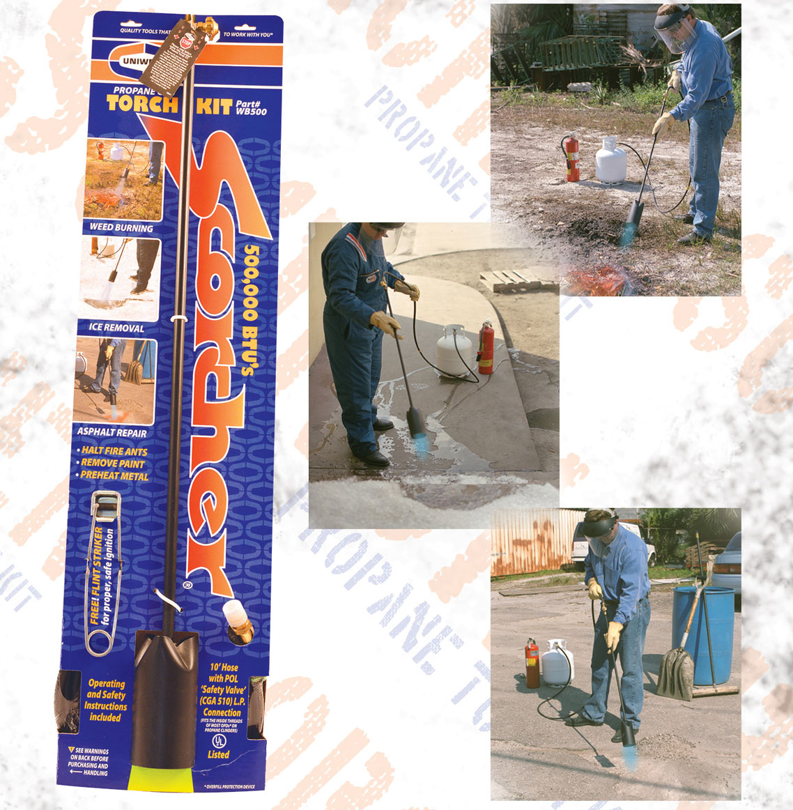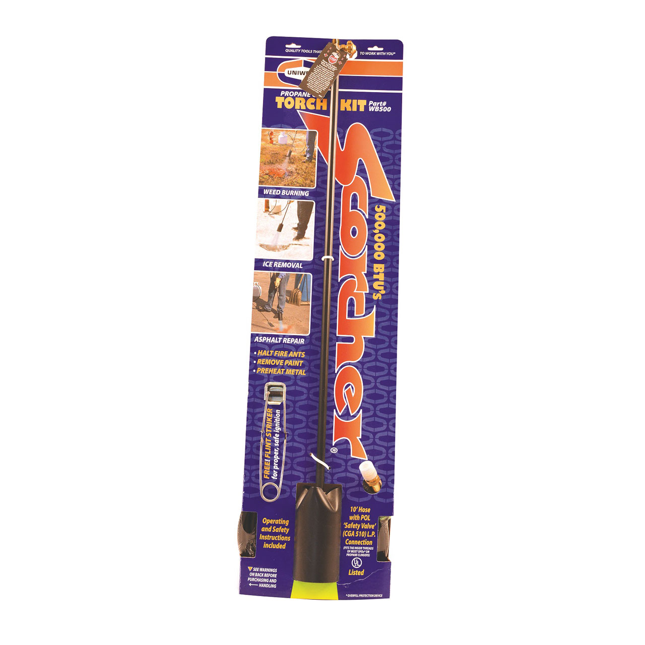 The Scorcher® Propane Gas Torch Kit also includes a 10′ hose with P.O.L Safety Valve & a flint lighter, for proper ignition.