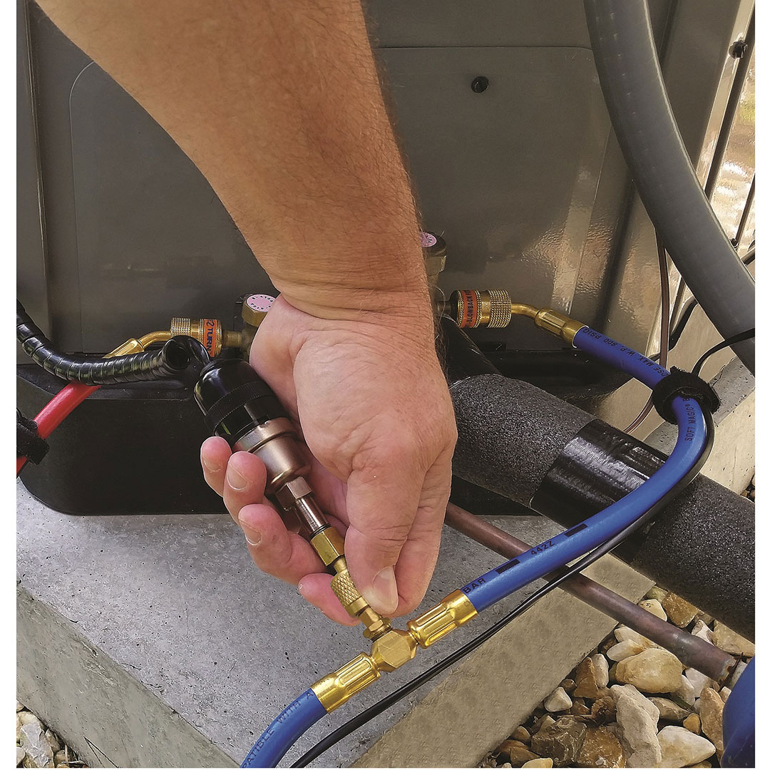 • EZ Access “T” Fitting™ for micron gauge connection built into the blue low side hose (Patents Pending)