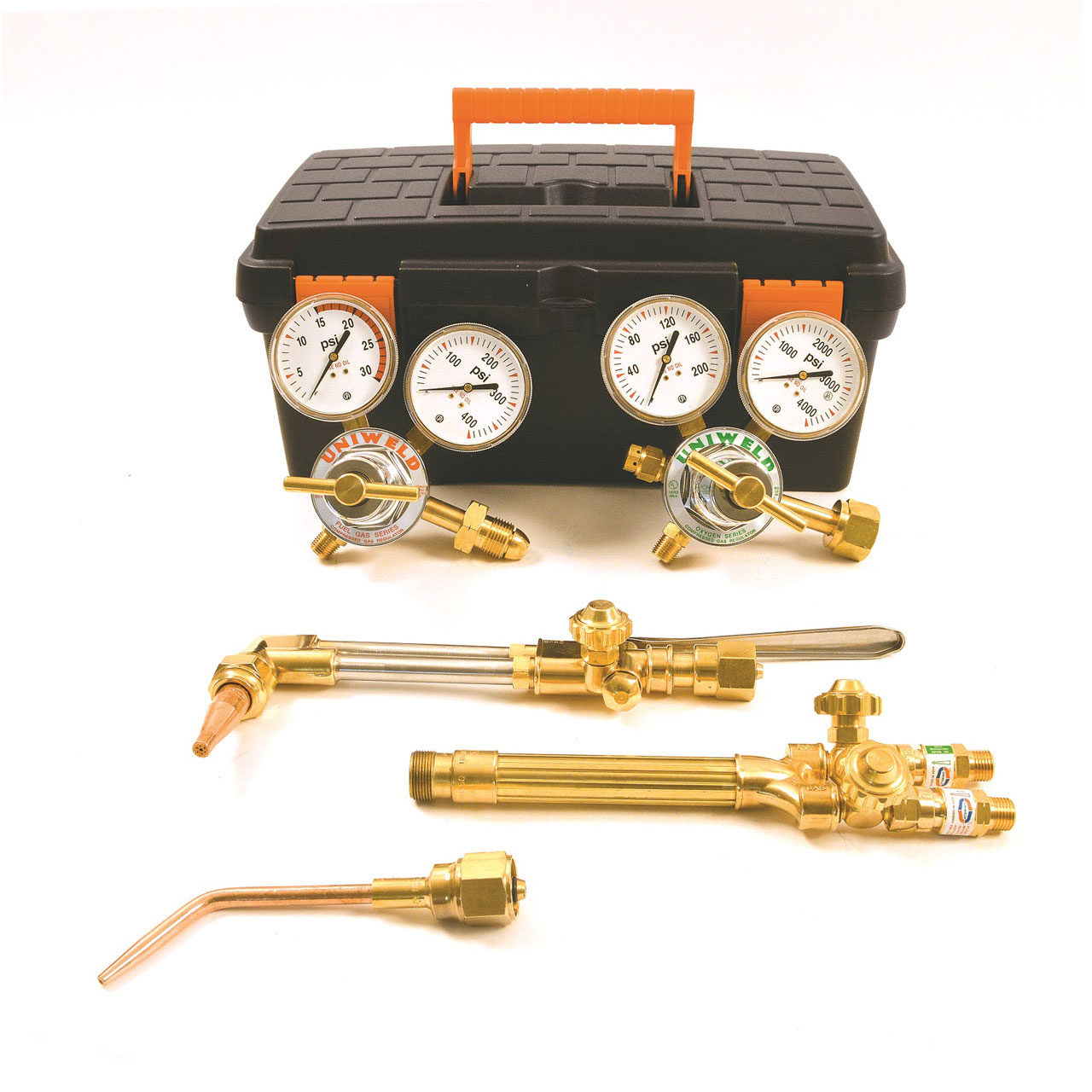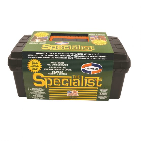 The Uniweld Specialist is a heavy duty oxy-fuel outfit for cutting, welding and brazing. Oxygen and fuel flashback arrestors with built-in check valves prevent reverse flow of gases and flashback. This outfit is packed in its own handy tool box with utility tray.