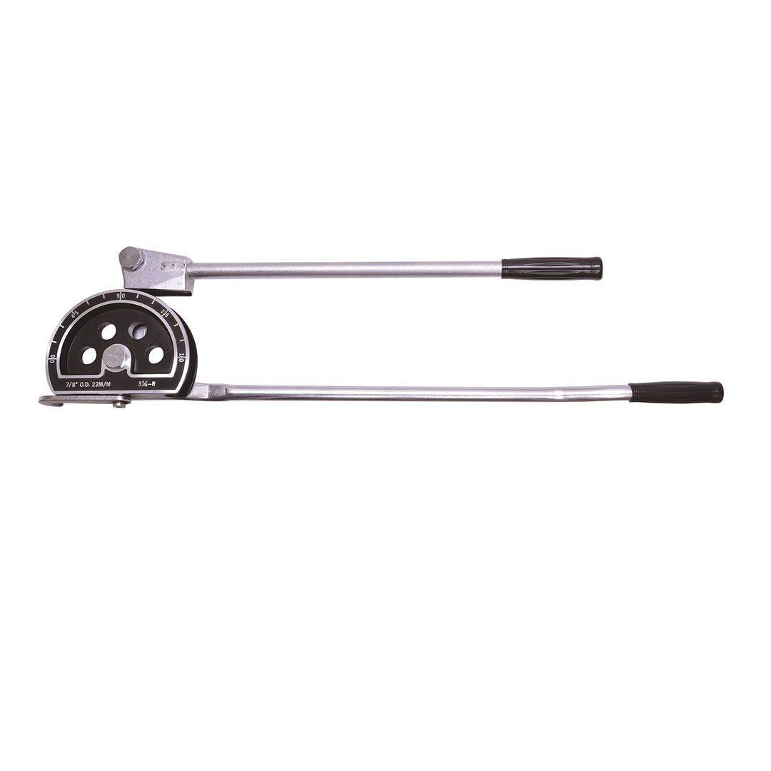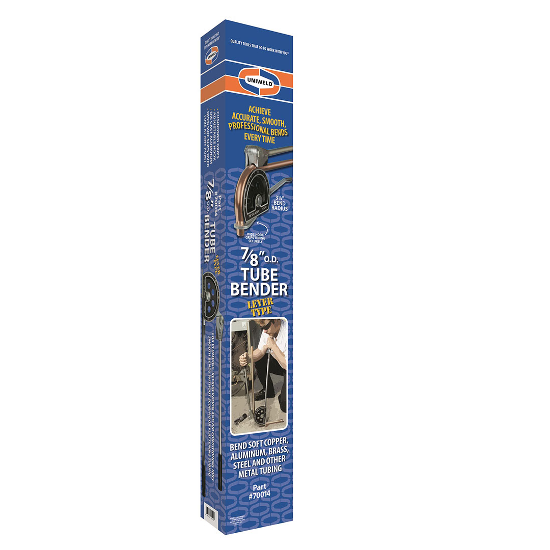 Uniweld’s Lever Type Tube Benders bend one size of soft copper, aluminum, brass, steel and other metal tubing. The calibrated markings show angle of bend for smooth, short radius bends up to 180°. Wide hook grips tubing securely.