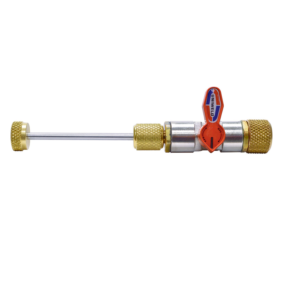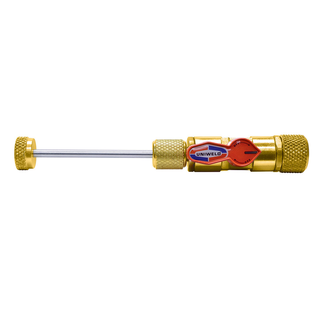 Uniweld’s Valve Core Removal Tool can remove and replace valve cores without losing the system’s refrigerant charge. Now you can temporarily remove valve cores for unrestricted line flow, providing faster recovery, evacuation and recharge of a system. The 3/8″ full flow ball valve, with positive 1/4 turn on/off, swivels 360° for easy access to the system service valves. Attach and isolate a micron gauge at the system using the Valve Core Removal Tool with 1/4″ side port adaptor. Compatible with all refrigerants, including R-410A.